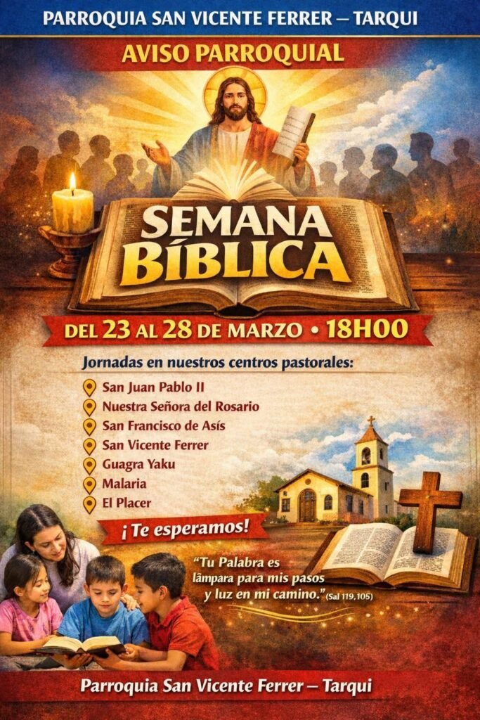 La Parroquia San Vicente Ferrer – Tarqui invita a todos los padres de familia, niños y jóvenes de la catequesis, y a todos los fieles de nuestra comunidad, a participar activamente en la Semana Bíblica, un tiempo especial para encontrarnos con la Palabra de Dios y fortalecer nuestra fe.