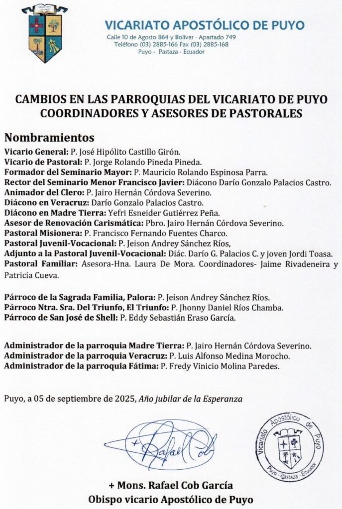 Cambios en las parroquias del Vicariato de Puyo.