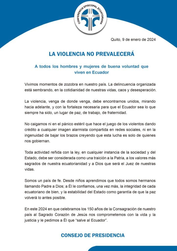 La Conferencia Episcopal Ecuatoriana emite un comunicado ante los hechos que vive el país.