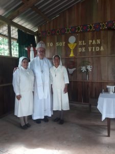Después de saludar la casa del catequista Carlos, fundador de esta comunidad,  nos trasladamos a la casa comunal lugar de la celebración donde tendremos la eucaristía en donde recibirán los sacramentos del bautismo y de la Primera comunión , es una comunidad  que poco a poco  se ha metido en la dinámica de proyectos de turismo comunitario, con el riesgo de poner su corazón el dinero que producen estos proyectos, hay varias parejas  de jóvenes que estudiaron en el internado de la Misión, también nos comentan que algunos cristianos evangélicos les han ofrecido regalos con su proselitismo,  lo cual constituye una amenaza a la unidad de la comunidad. Nosotros como Iglesia  Les dejamos los grandes regalos de los sacramentos  para alimentar y fortalecer su fe que son las mayores riquezas  para un cristiano.