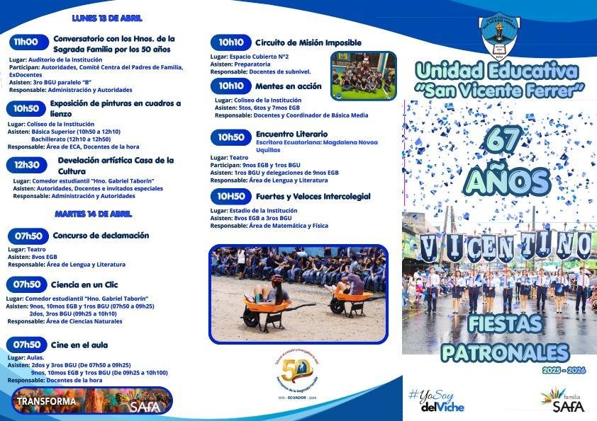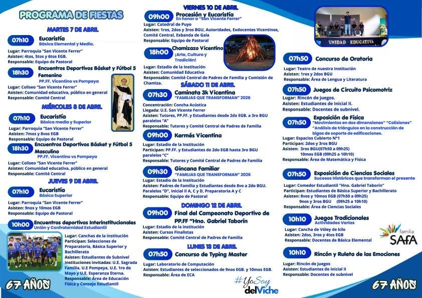 Invitación a las Festividades de la Unidad Educativa» San Vicente Ferrer». En sus 67 Años Vicentino.