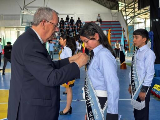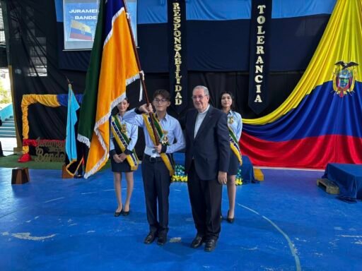 Mons Rafael Cob Obispo del Vicariato Apostólico PUYO participó en la ceremonia de proclamación de abanderados, portaestandarte, escoltas y juramento a la Bandera de la Unidad Educativa San Vicente Ferrer.