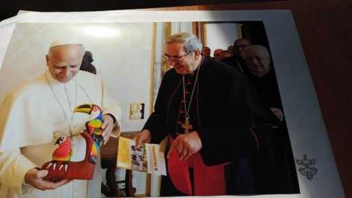 Así mismo, Monseñor Cob, en la audiencia con el Papa entregó artesanías de Puyo.