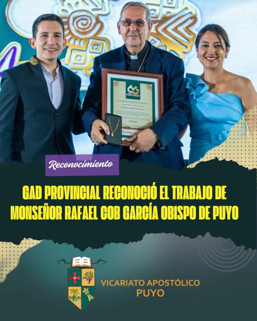 En la sesión solemne por los 66 años de provincialización, Mons Rafael Cob recibió un reconocimiento de parte de la Prefectura de Pastaza por el trabajo social, servicio pastoral, defensa de los derechos de la comunidades, protección a la casa común, en favor de los pueblos amazónicos por más de 25 años en el Vicariato Apostólico de Puyo.