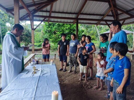 El padre Kevin Tapia y la hermana Ana Victoria Muñoz, visitaron recientemente las comunidades Saparas de Cuyacocha, Turisha y Atatacuingia, pertenecientes a la parroquia Nuestra Señora de la Asunción de Montalvo. Estas comunidades están ubicadas en la selva de Pastaza, un lugar remoto y de difícil acceso, donde la única forma de ingreso es vía aérea con una duración de 35 minutos.